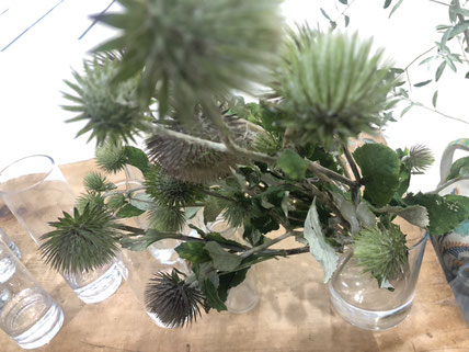 バラ(アバランチェ、セントピーターズバーグ、ジリアン、シュバルツシルト、ココット、ザ・セレスティアル、シルバーレース)/トルコキキョウ(セレブシルキーピンク)/スカビオサ/アマランサス(ホットビスケット)/あじさい(鉢)/チランジア/ミナロキアジサイ/ユーカリ/きく(トゥーラグリーン)/ガーベラ(パスタ)/ダリア(ハミルトンリリアン)/ニゲラ/モルダナ/あわ/なでしこ/ロータス/ソテツ/フィロデンドロン etc.